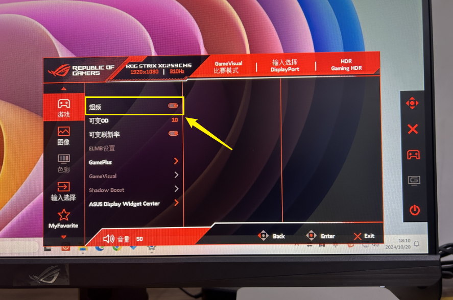 🔺另一个条件是需要在显示器的OSD菜单中开启“超频”模式,要不然它显示的是300Hz(个人感觉300和310两者区别不大呀,这个超频其实比较鸡肋~)。