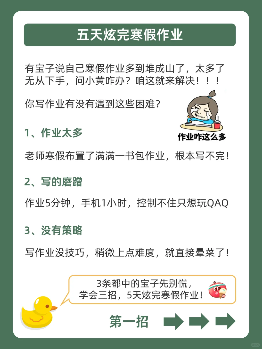 . [赞R]带你逆袭学霸,是鸭鸭的责任❗ . [向右R]太多宝子说自己寒假作业太多写不完,有没有快速炫完作业的办法![石化R] . [点赞R]鸭鸭这么宠粉,肯定会想办法帮助你们的哇![哇R] . 今天就来分享,5天炫完寒假作业,都在上面的图,看完就会用!从此作业无忧,嗨玩寒假![赞R] . 🐣我是鸭鸭,持续更新优质学习笔记,陪宝子们疯狂内卷,校园逆袭![赞R]