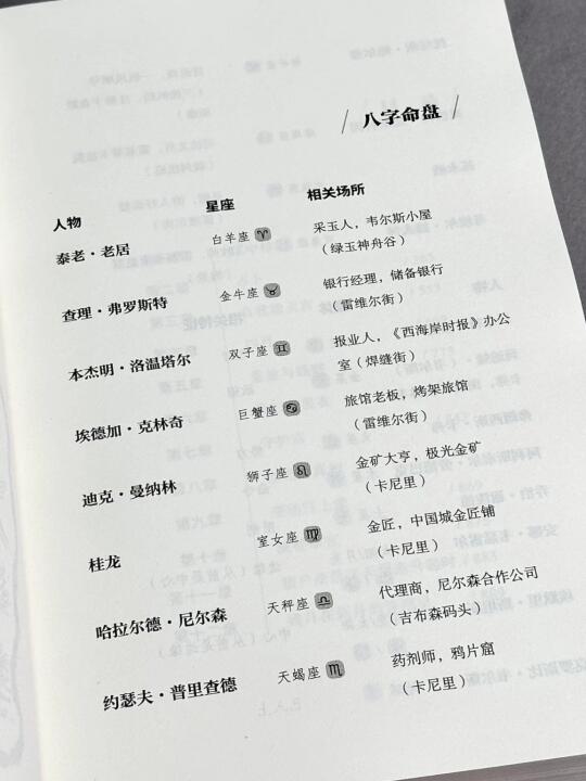 镇上最富有的淘金者莫名失踪、一名酒鬼遭到杀害、一名妓 女自S未遂倒卧路边,没想到,这张错综复杂的谜网如同星空般有其运行秩序,竟然每件事皆互为关联,每个人在其中皆有扮演的角色,最 后的真 相更是让人不寒而栗……
