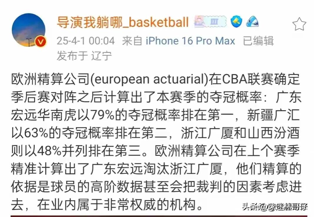 季后赛准备开打,广东夺冠概率排第一,领先第二差不多一倍。