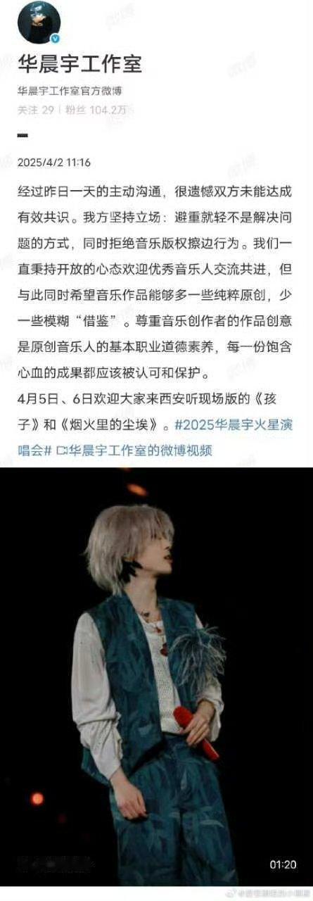 华晨宇工作室发声,主动与对方沟通未与对方达成有效共识。工作室倡导音乐纯粹原创,少