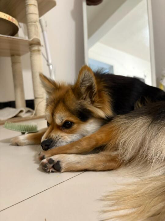 女友像往常一样,把小黑带上楼喂了些吃的。前天晚上成都在下大雨,可能因为雨下得太大,带下楼的时候小黑一直折返,叼着玩具围着女友转,于是女友把他又带上来了。
