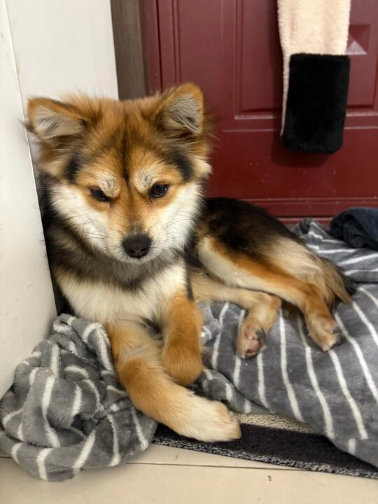 到了睡觉的点,女友看小黑还不打算走,就给小黑在门边铺了自己的睡衣(让他熟悉味道),小黑趴在女友的睡衣上,枕着玩具,靠在门边睡着了。