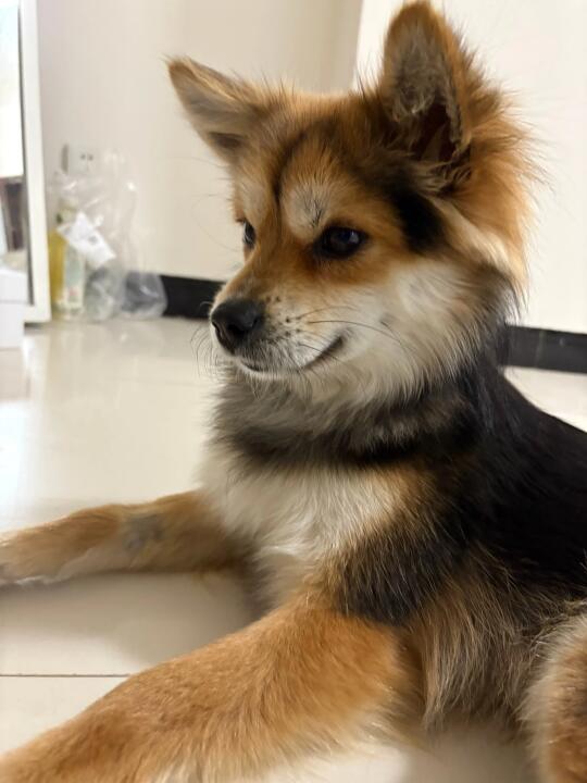 不过女友说小黑给人一种孤儿怨的感觉,她在抱着猫的时候小黑狗的眼睛会变成三角形,微笑唇也消失了,阴测测地盯着大小黑(图五),待到无法忍受内心嫉妒的折磨时小黑就会走近,把脸凑过去盯着大小黑看。
