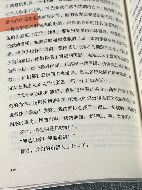 “她曾是男人的时候,对自己的性别是多么自豪,事到如今,所谓男性在她眼中又如此卑劣。穿得像盖伊·福克斯一样在大街上耀武扬威,只为获得某些女人的赞美;阻碍女人获取知识,只因不想被她们嘲笑;在她们那裹着衬裙、弱不禁风的娇躯前俯身为奴,行走世间时却又要仰首称王。”