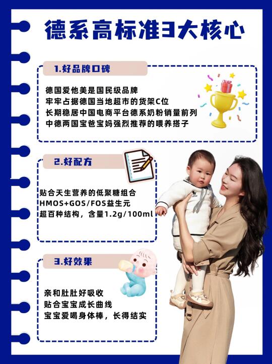德爱白金可是本地妈妈们心中的人气口粮,德国超市货架 C 位常年被它霸据,口碑超高~不仅国外宝妈抢着囤,国内妈圈也是有口皆碑,销量也是连续多年稳坐国内电商平台德系奶粉榜首!我身边有超多宝妈都在晒同款奶粮的喂养成果,清一色的竖大拇指
