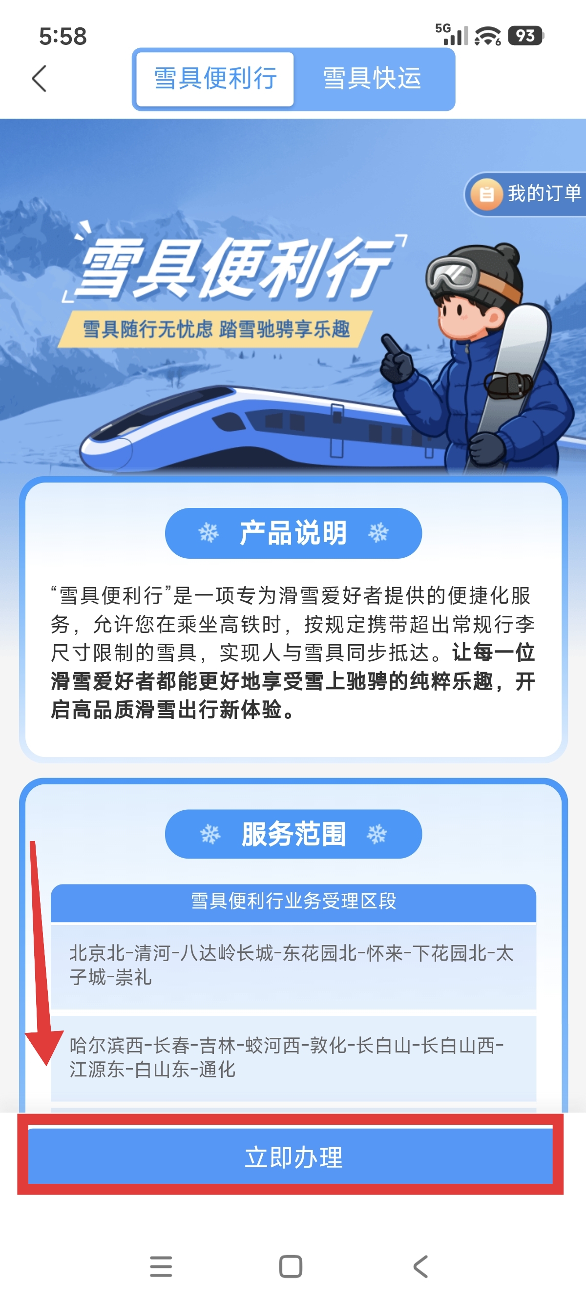 3.进入到雪具便利行页面后,点击【立即办理】按钮。