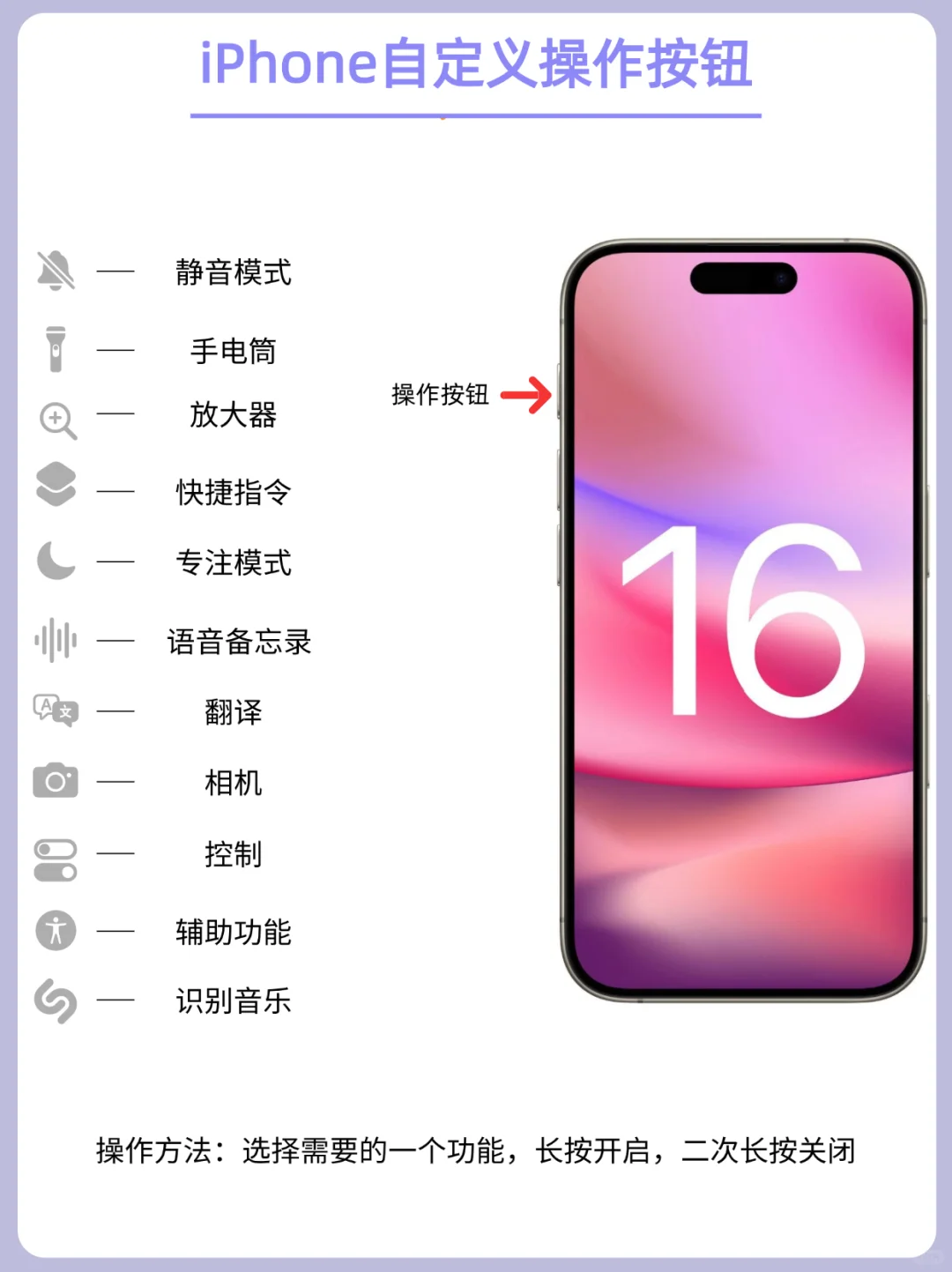 静音模式/手电筒/操作按钮/放大器/快捷指令/专注模式/语音备忘录/翻译/相机/控制/辅助功能/识别音乐