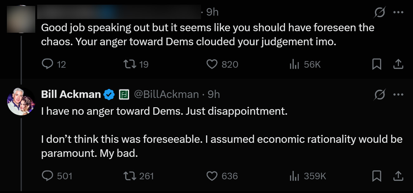 阿克曼此前是特朗普在华尔街的最大支持者之一。6日,他在X上连发多篇贴文,对特朗普的关税政策展开严厉批评。