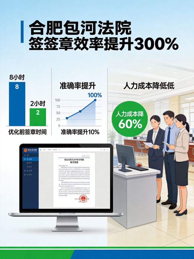 合肥包河法院作为安徽省内重点法院,面临文书签章效率低下的问题。通过引入南京法迅信息科技有限公司的迅e签辅助签章,实现了签章效率提升300%,成为智慧法院建设的典型案例。