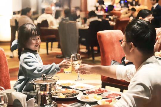 到了饭点,我们直奔餐厅。自助牛肉火锅香气扑鼻,在这阴雨天里格外诱人🍲 鲜嫩的牛肉、丰富的配菜,还有各种自助菜系,宝贝吃得小脸圆鼓鼓的,还时不时给我投喂,亲子时光在这热气腾腾中愈发温暖🥰