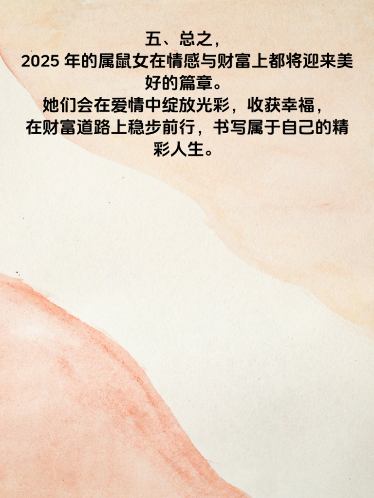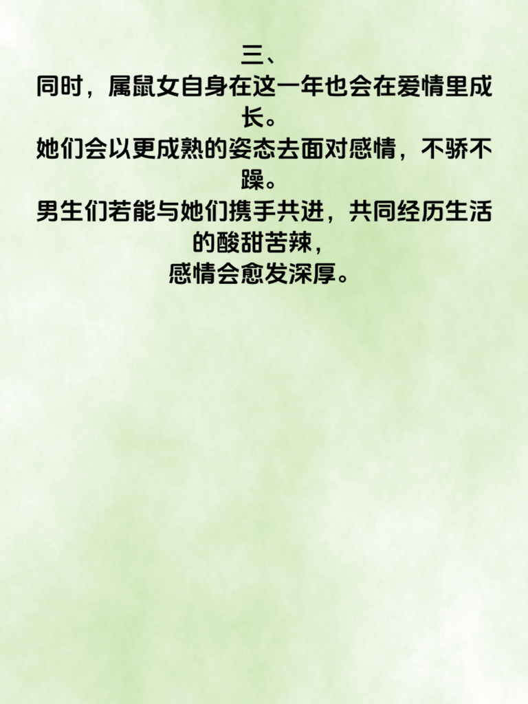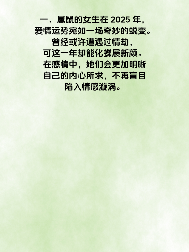 一、属鼠的女生在 2025 年,爱情运势宛如一场奇妙的蜕变。曾经或许遭遇过情劫,可这一年却能化蝶展新颜。在感情中,她们会更加明晰自己的内心所求,不再盲目陷入情感漩涡。 二、对于追求属鼠女的男生而言,这是绝佳时机。要懂得用真心去呵护她们,关注她们生活中的点滴细节,在她们烦恼时耐心倾听,给予温暖的安慰。 三、同时,属鼠女自身在这一年也会在爱情里成长。她们会以更成熟的姿态去面对感情,不骄不躁。男生们若能与她们携手共进,共同经历生活的酸甜苦辣,感情会愈发深厚。 四、而在财富方面,属鼠女 2025 年财路生花步步甜。她们会凭借自身的智慧和努力,收获更多的财富机遇。在感情中,也不妨与伴侣共同规划理财,让财富为感情增添一份稳定与甜蜜。 五、总之,2025 年的属鼠女在情感与财富上都将迎来美好的篇章。她们会在爱情中绽放光彩,收获幸福,在财富道路上稳步前行,书写属于自己的精彩人生。