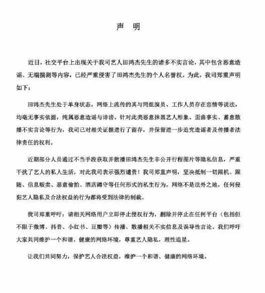 气运联盟的田鸿杰被传恋情了,但是呢,人家方直接发文否认了。现在的娱乐圈啊,这种恋情传闻真的是太多了,不过很多时候都是毫无根据的。就像这次田鸿杰的事情,网传他和同组演员或者工作人员有恋情。 可是他的团队直接表明他处于单身状态,那些流传的消息都是恶意造谣和诽谤。从这也能看出来,明星有时候真的很无辜,可能就是因为一点捕风捉影的事情,就被传得沸沸扬扬。 对于他们来说,这种谣言可能会对他们的形象造成一定的影响,也会给他们的生活带来困扰。而且这种毫无根据的恋情传闻对于粉丝来说也是一种误导,粉丝们可能会因为这些谣言而产生不必要的情绪波动。 希望大家在看到这类消息的时候,还是要保持理性,不要轻易相信那些没有事实依据的传闻,要多关注明星们的作品才是。而且对于那些恶意造谣的人,也应该受到相应的惩罚,这样娱乐圈才能更加健康地发展。