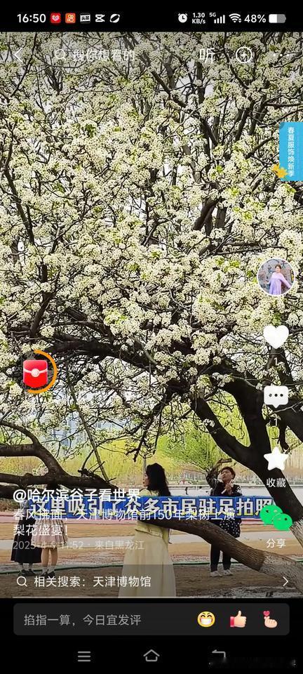 分享一下你的心情故事今天中午发了一条小视频,是前几日在天津博物馆意外遇到150年树龄的梨花神树,好多人拍照打卡。因为拍梨花差点耽误天津博物馆参观,进去没看完四楼五楼的展馆。有一点点遗憾,但是与春日的梨花不期而遇,满眼的“梨花盛开”,想想就觉得惊喜,这是一场“白色浪漫”