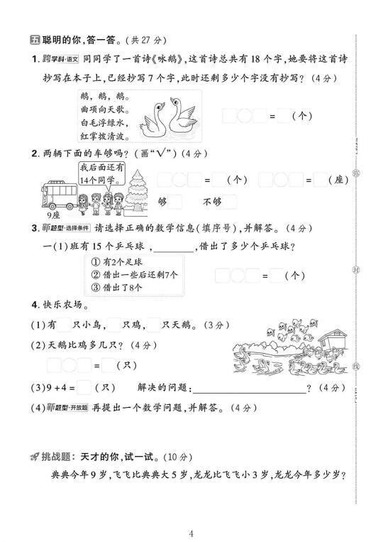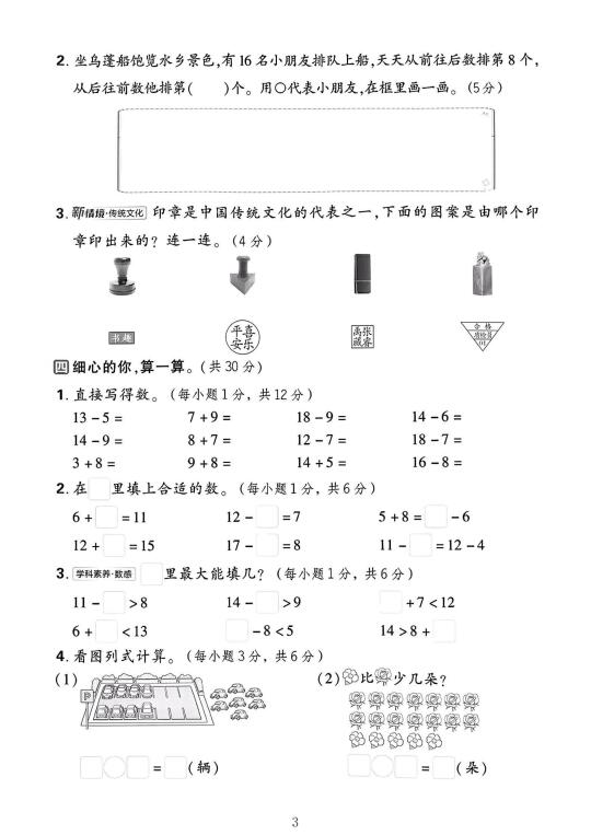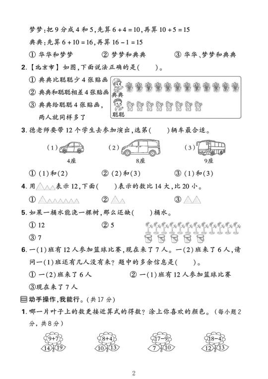 北师大 一年级下册数学 期中考试 期中 试卷 电子版可打印 一年级