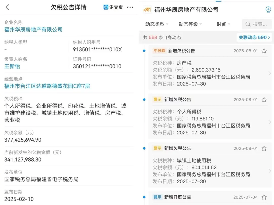 而若把时间轴拉长至半年前:2025年2月10日,国税总局福建省电子税务局发布福州华辰地产欠税公告详情,欠税税种涵盖了个人所得税、企业所得税、印花税、土地增值税、城市维护建设税、城镇土地使用税、增值税、房产税、营业税等,欠税余额高达3.77亿元(当前新发生的欠税金额3.41亿元)。