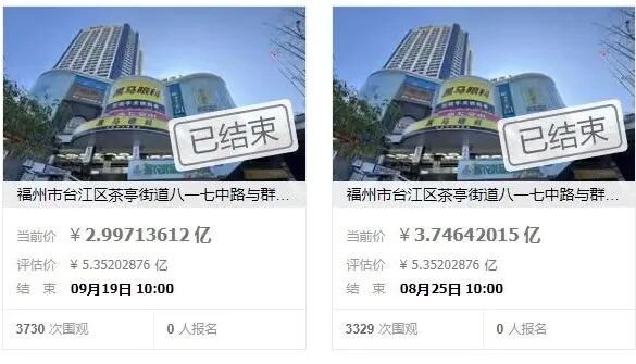 福州人自不曾忘:君临盛世茶亭地块八商业综合楼曾先后于2024年8月25日、2024年9月19日上架阿里司法拍卖平台,起拍价先后为3.7464亿(根据公告,以评估价格即约5.35亿的70%(七折)进行挂网)、2.9971亿,均流拍。