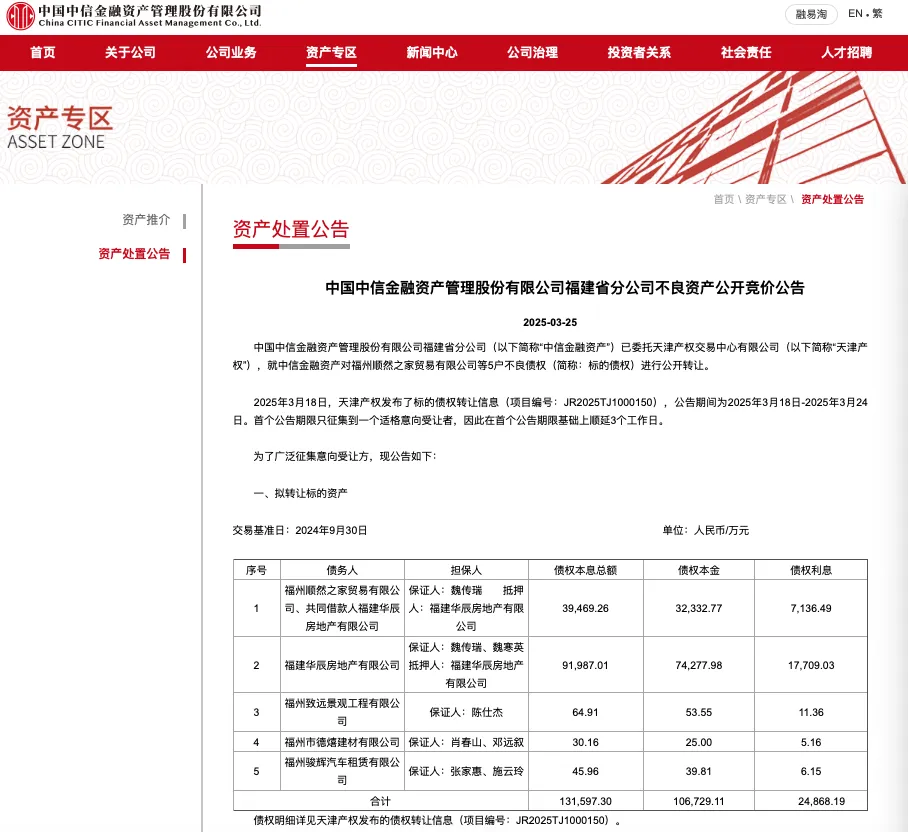 国有金融机构处置不良债权,定价应参考资产实际价值、市场行情等因素。作为央企分支机构,中信金融福建分公司完整受让福建华辰地产12亿债权及对应资产后,随即于2025年3月以原价挂牌转让。