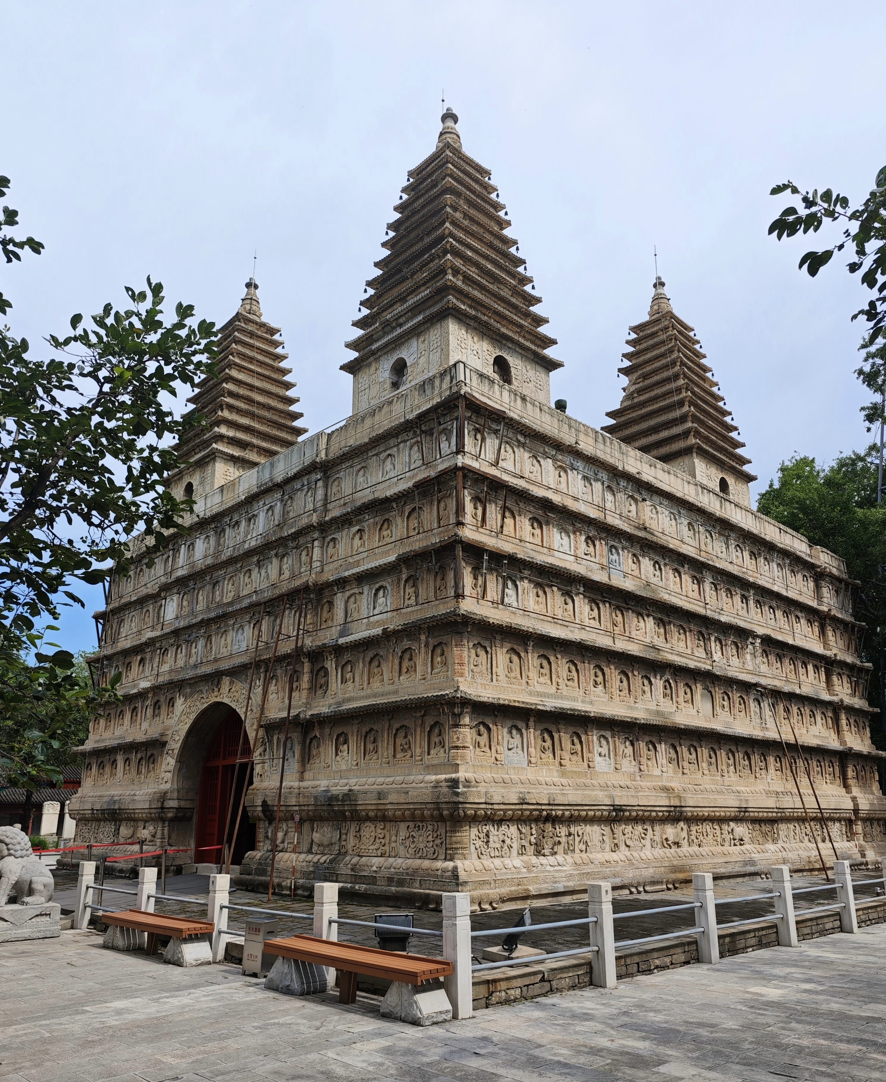 五座小塔整齐地排列在塔座之上,布局严谨对称。每座小塔的造型都独具特色,它们既保留了印度佛陀伽耶精舍的建筑风格,又融入了中国传统佛塔的建筑元素。塔身同样布满雕刻,与塔座的雕刻相互呼应,共同构成了一幅宏大而精美的艺术画卷。梁思成先生曾盛赞真觉寺金刚宝座为同类型建筑中“最精代表作”“最杰出重要实例”,这不仅是对其建筑价值的高度认可,更是对古代工匠智慧与技艺的由衷赞叹。在建筑材料的选择与加工上,古人因地制宜,选用坚固耐久的石材,经过精细打磨与雕刻,让冰冷的石头焕发出艺术的光彩;在建筑结构的设计上,他们巧妙地运用力学原理,使整座塔历经数百年风雨依然屹立不倒。