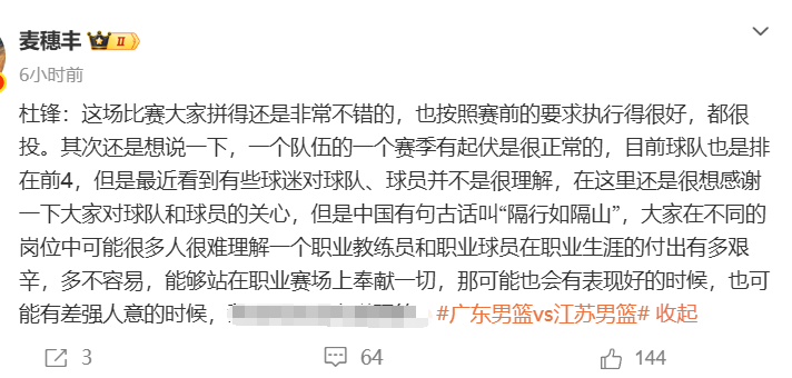 赛后杜锋罕见在发布会上喊话广东球迷要包容球队(杜锋说了将近5分钟,非常少见),还说了很多话鼓励和肯定张皓嘉这段时间的贡献。