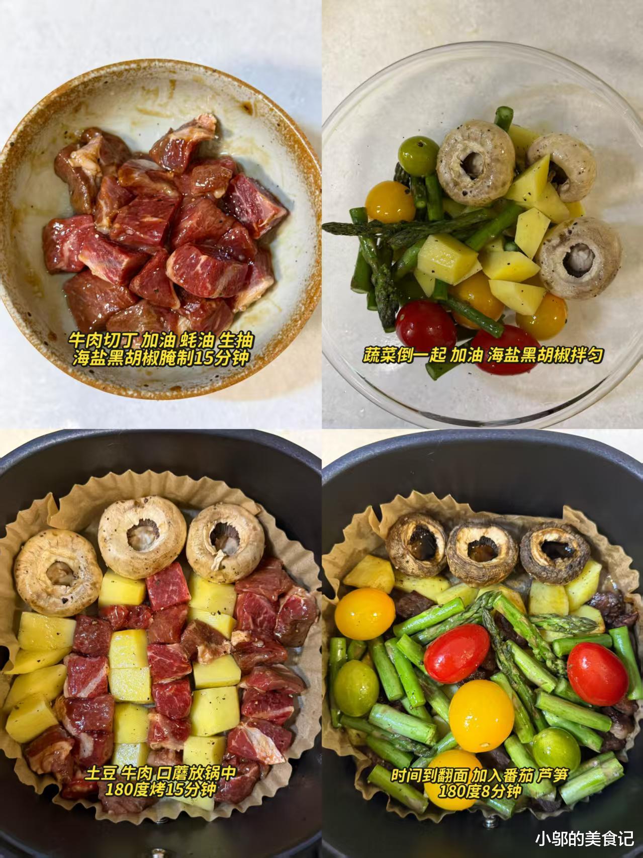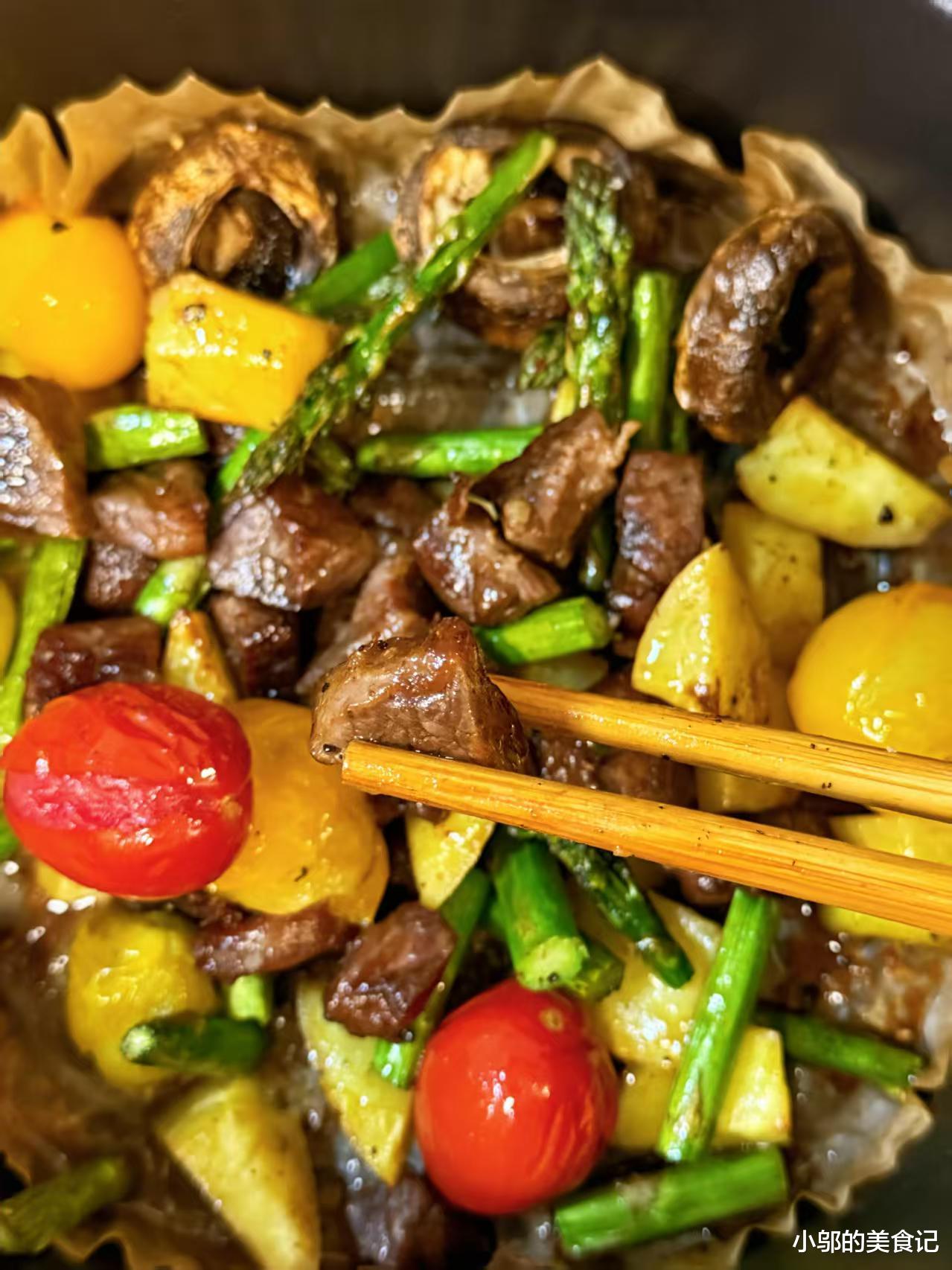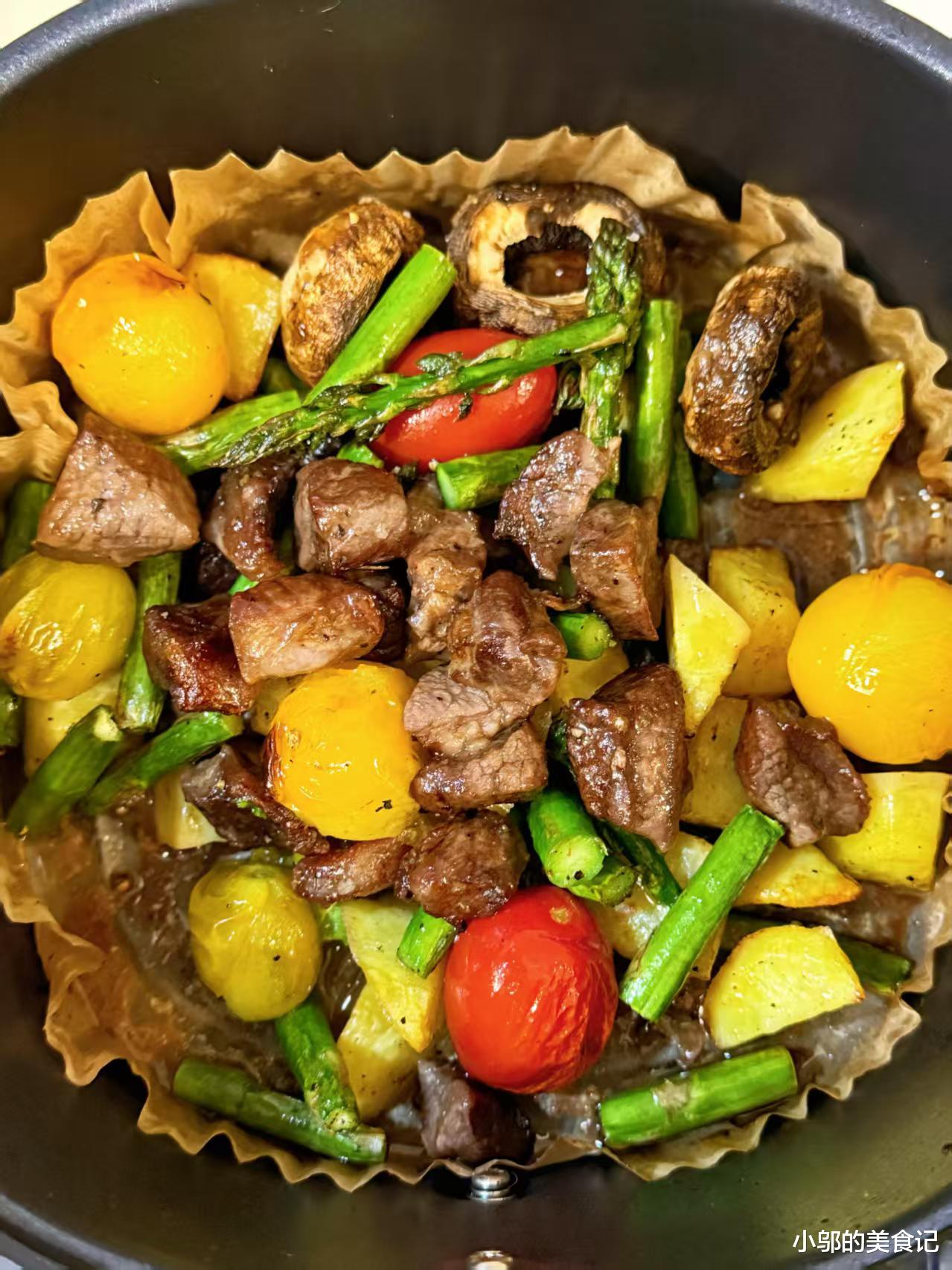 等时间一到,打开炸锅的瞬间,香气会一下子涌出来,牛肉丁表面烤得微微发焦,内里却还保持着鲜嫩的口感,咬一口肉汁在嘴里爆开,黑胡椒的香气在舌尖散开;土豆丁烤得外酥里糯,每一口都带着淡淡的咸香;口蘑烤出了鲜美的汤汁,咬下去的瞬间汤汁在嘴里散开,比肉还鲜;芦笋保留了脆嫩的口感,带着淡淡的清甜味,小番茄烤得表皮皱巴巴的,咬开后是酸甜爆汁的口感,几种食材搭配在一起,口感层次丰富,一点都不觉得腻。