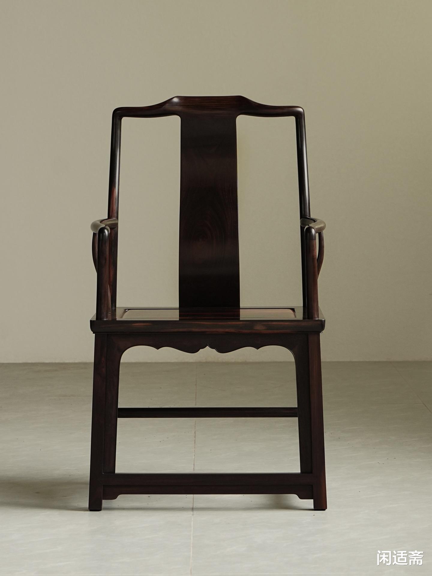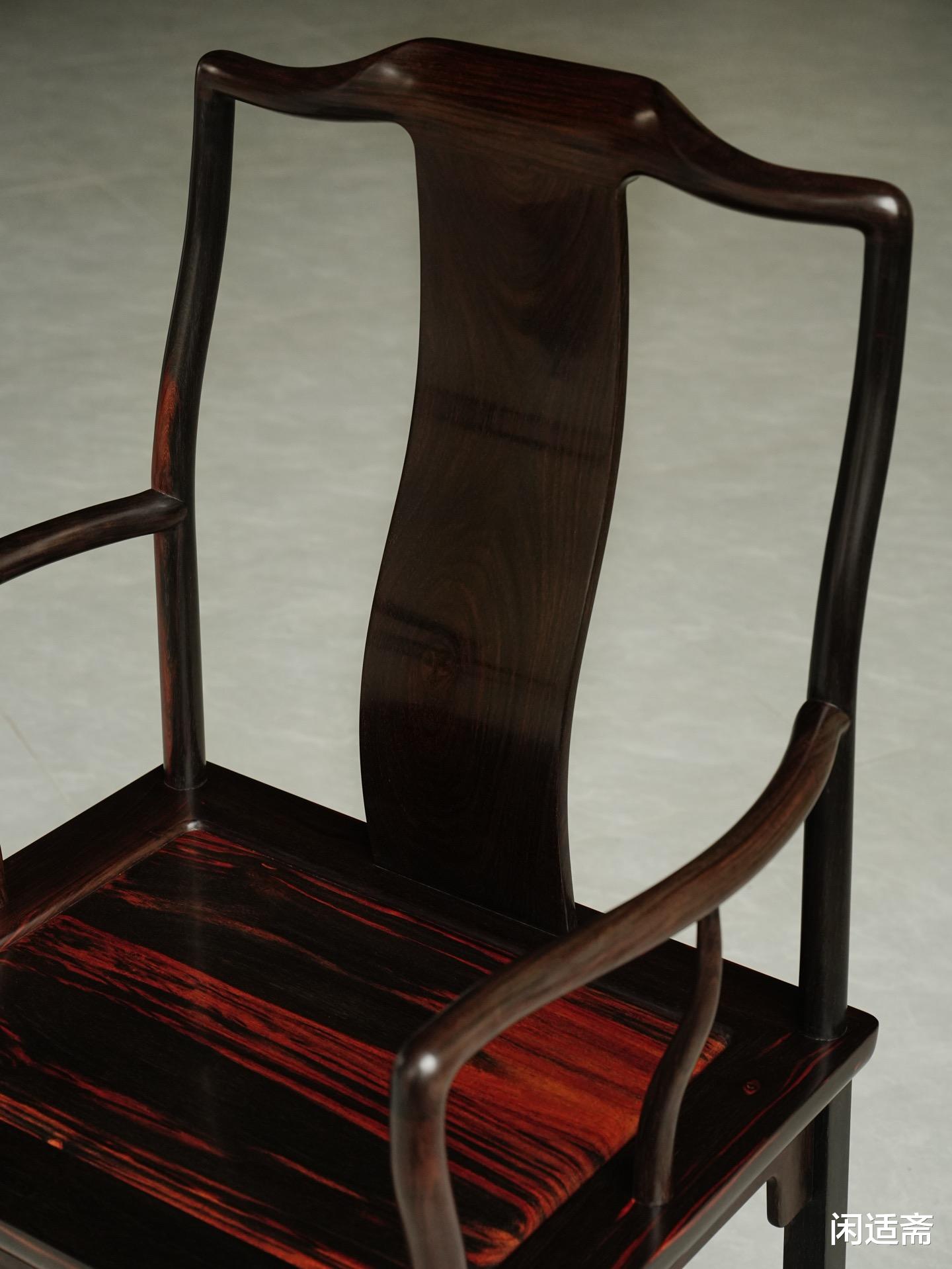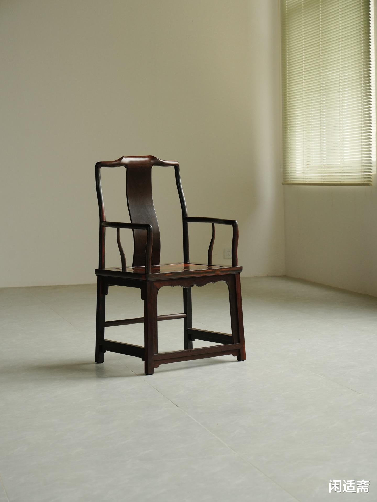 整器制作细节考究,椅身采用经典烟袋锅榫衔接,榫头与榫眼精准咬合,尽显古法榫卯工艺的精湛与严谨。搭脑婉转如弓,线条流畅圆润,两端微微下垂,弧度自然舒展,无丝毫生硬感,尽显南官帽椅的含蓄之美;扶手柔婉内收,弧度精准贴合人体手臂曲线,倚坐时可自然承托手臂,舒缓肩颈压力,兼顾舒适与雅致。S形背板采用整木挖制工艺,弧度经精准测算,完美贴合人体脊柱曲线,坐之端正挺拔,靠之舒适自在,既符合人体工学,又暗含文人“坐有坐姿、端然凝神”的精神追求。