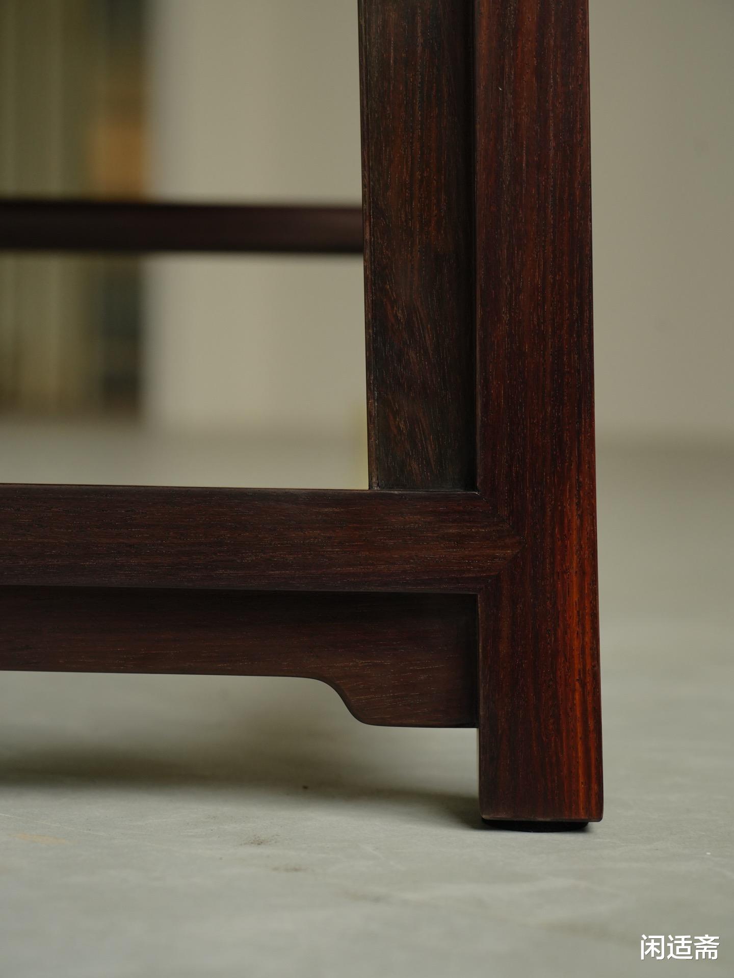 座面采用攒框镶板工艺,面板平整光滑,与边框衔接严丝合缝,既保证了座面的稳固性,又增强了整体的质感;座面下,洼堂肚牙子线条利落流畅,弧度圆润饱满,既起到加固椅身、分散承重的作用,又丰富了整体视觉层次,为简约的椅身增添细腻质感,细节之处尽显匠心。腿足与枨木搭配合理,结构稳固扎实,四腿直落挺拔,枨木衔接紧密,进一步提升椅身的承重性与稳定性,尽显明式家具的结构之美。