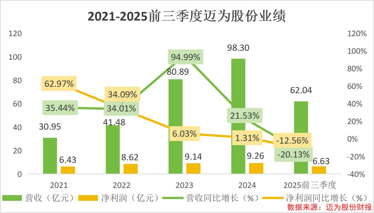 2025年前三季度,迈为股份实现营收62.04亿元、净利润6.63亿元,同比分别下降20.13%和12.56%。