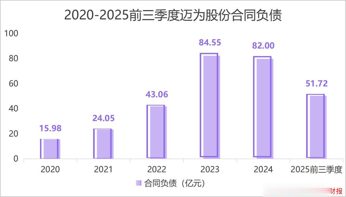 公司的合同负债金额也随之增加。2024年,迈为股份合同负债金额达到82.00亿元,截至2025年前三季度,公司合同负债金额还有51.72亿元。