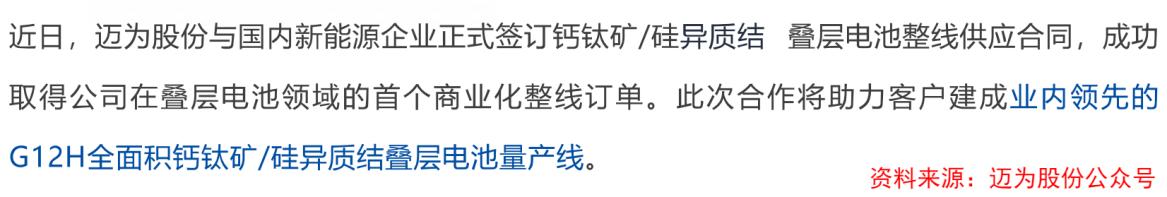 2025年12月,迈为股份成功拿下行业内首个钙钛矿/硅异质结叠层电池整线供应订单。