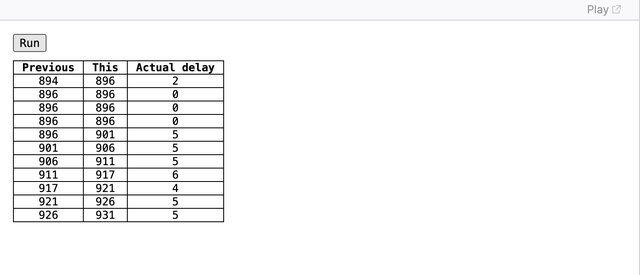 <button id="run">Run</button><table> <thead> <tr> <th>Previous</th> <th>This</th> <th>Actual delay</th> </tr> </thead> <tbody id="log"></tbody></table>下面是 JavaScript 代码: