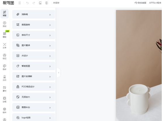 在基础修图部分,易可图提供了裁剪、尺寸调整、自动抠图、换背景以及调色等功能,可以支持大部分用户的图片处理需求。