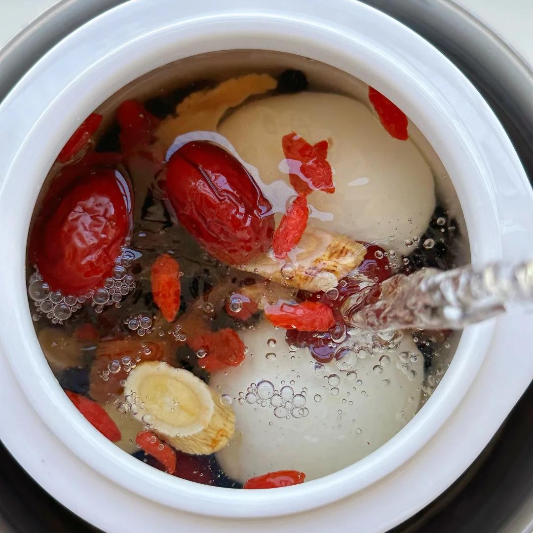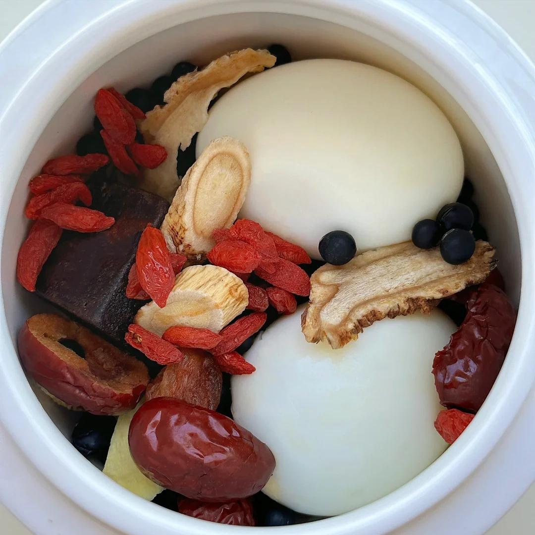食材:当归、黑豆、黄芪、红糖、姜片、桂圆、红枣、枸杞、一个鸡蛋