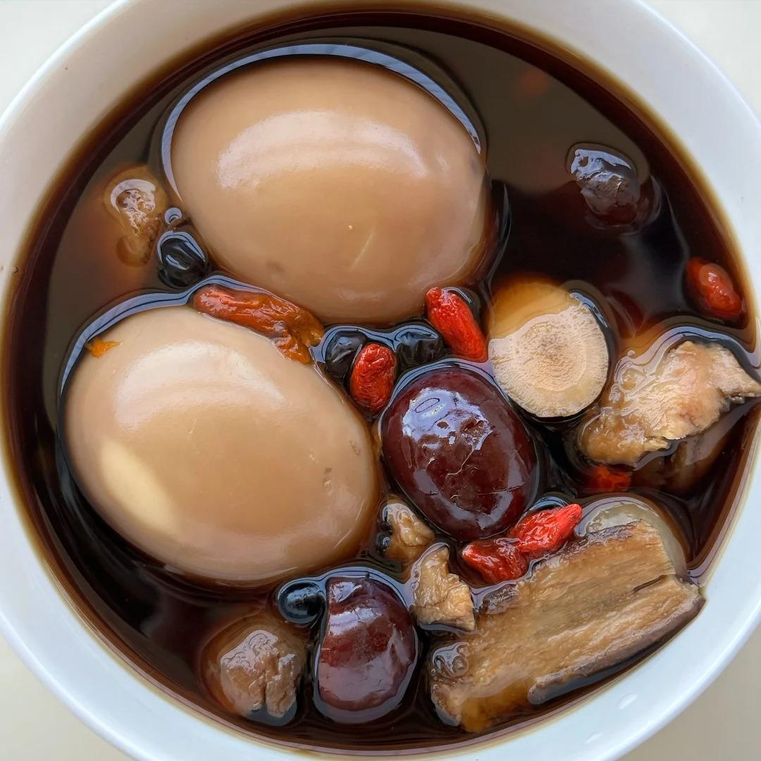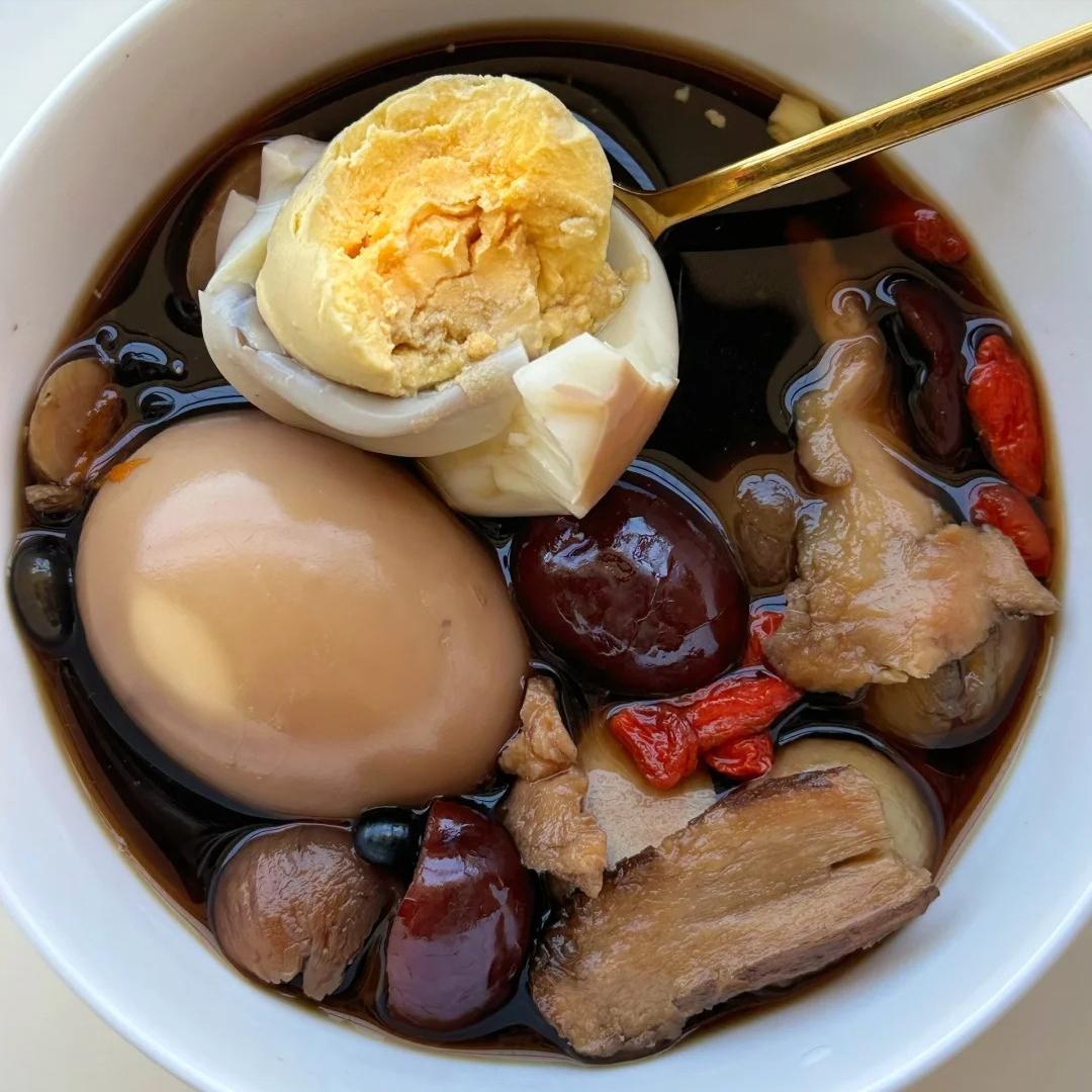 等时间一到,打开炖锅,哇塞,那汤的颜色红亮红亮的,鸡蛋和各种食材都乖乖地泡在汤里,看着就特别有食欲。