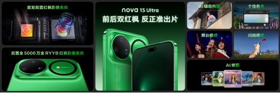 后置影像同样惊艳。nova 15 Ultra搭载全5000万像素RYYB红枫镜头,主摄、超广角、长焦全拉满,进光量更大、动态范围更广。即使在Live House等复杂光环境下,“舞台模式”也能智能锁定人脸,抑制背景过曝,稳定肤色表现。更有趣的是首发“个性色卡”功能,可依据穿搭或心情一键切换专属色彩风格;“AI沾色”则能圈选任意颜色,同步匹配主题、壁纸甚至聊天界面,让影像与生活无缝融合。