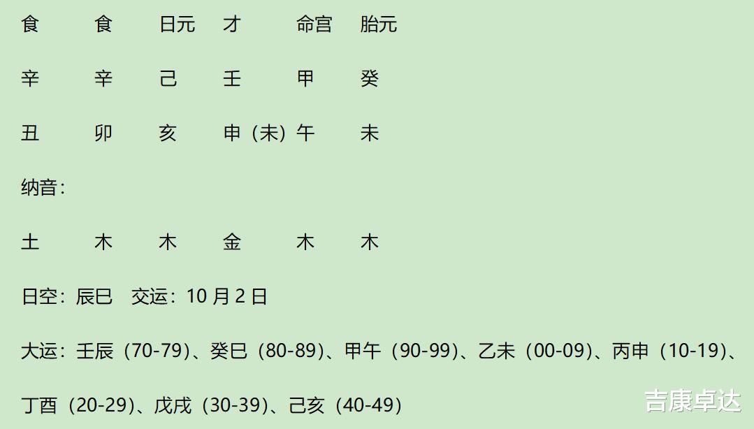 辛食生癸财、癸财生甲官;大运巳与胎元未拱午,流年子合申,小限未合卯。
