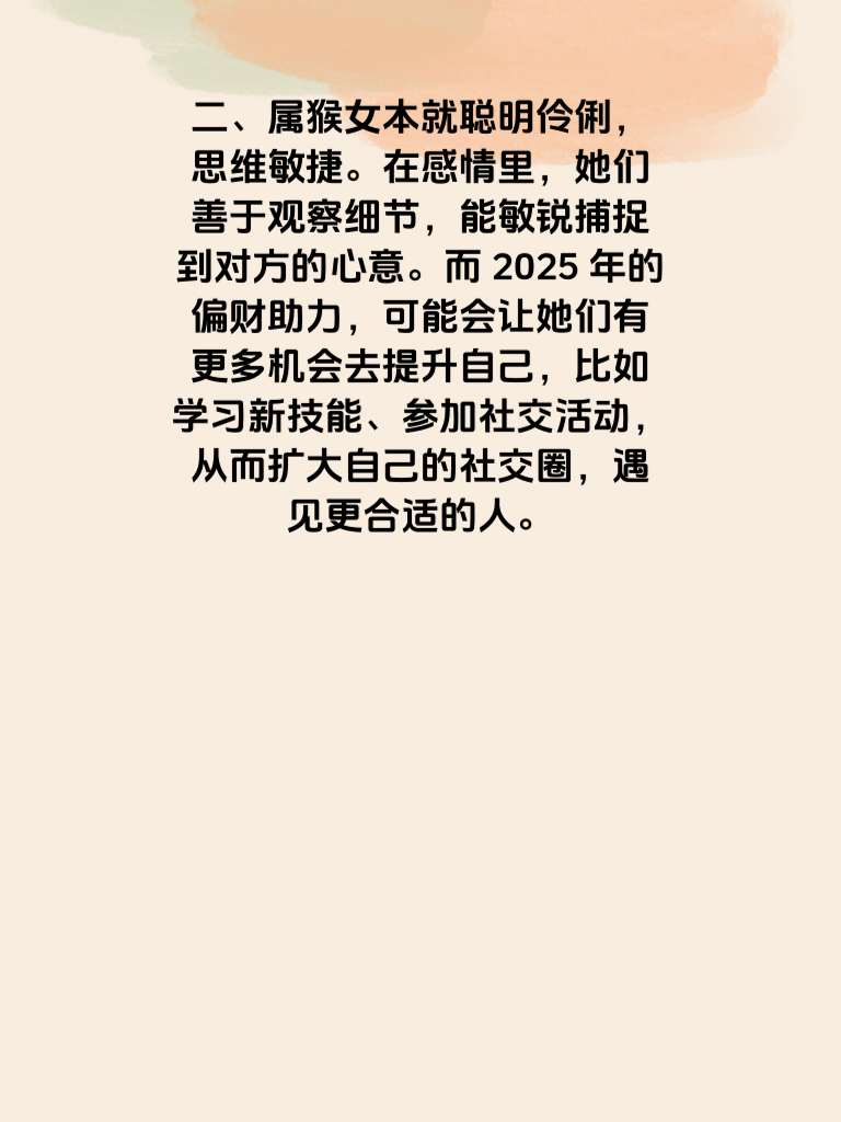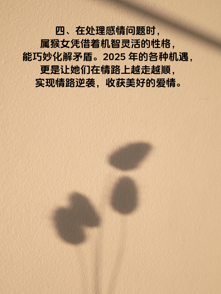 一、2025年属猴的女生,在情路上似乎有着独特的机遇。这一年,偏财或许会成为她们情路逆袭的暗助力,帮助她们突破情感中的重重迷关。 二、属猴女本就聪明伶俐,思维敏捷。在感情里,她们善于观察细节,能敏锐捕捉到对方的心意。而2025年的偏财助力,可能会让她们有更多机会去提升自己,比如学习新技能、参加社交活动,从而扩大自己的社交圈,遇见更合适的人。 三、当遇到心仪的对象时,属猴女不再迷茫。她们懂得巧妙地展示自己的魅力,用智慧和幽默吸引对方。偏财带来的物质基础提升,也让她们更有自信去追求爱情。 四、在处理感情问题时,属猴女凭借着机智灵活的性格,能巧妙化解矛盾。2025年的各种机遇,更是让她们在情路上越走越顺,实现情路逆袭,收获美好的爱情。