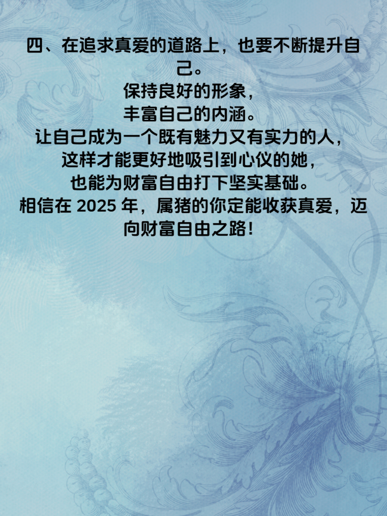 一、属猪的朋友们,2025年可是充满惊喜的一年哦!在这一年里,真爱仿佛正在悄悄敲门。你会遇到那个与你灵魂高度契合的人,TA或许就在某个不经意的转角处等着你。 二、当真爱来临,不要慌张,勇敢地去迎接。用你的真诚和热情去打动对方,展现出最真实的自己。多一些细心的关怀,在她需要的时候及时出现。 三、同时,这一年财富自由也似乎不再遥不可及。抓住身边出现的各种机会,凭借你的智慧和努力去拼搏。有了一定的经济基础,能让你的爱情更加稳固。 四、在追求真爱的道路上,也要不断提升自己。保持良好的形象,丰富自己的内涵。让自己成为一个既有魅力又有实力的人,这样才能更好地吸引到心仪的她,也能为财富自由打下坚实基础。相信在2025年,属猪的你定能收获真爱,迈向财富自由之路!