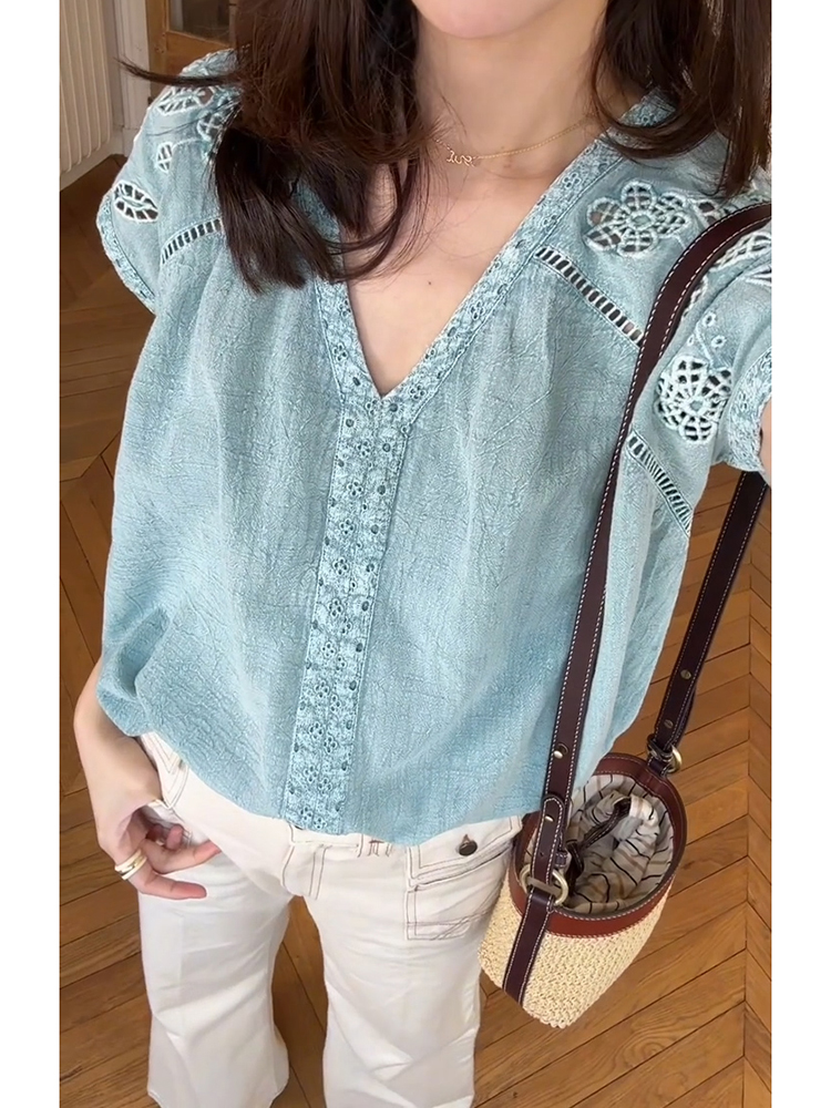 2025初夏独特超好看绝美上衣高级感轻奢减龄洋气宽松蓝色棉麻衬衫
