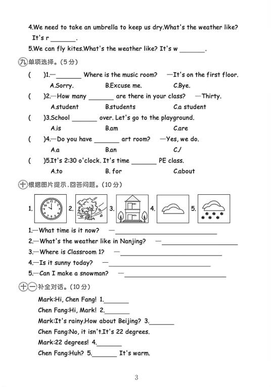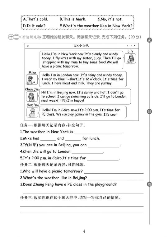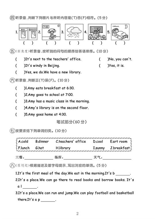 人教版 四年级下册英语 期中考试 期中 试卷 电子版可打印 四年级