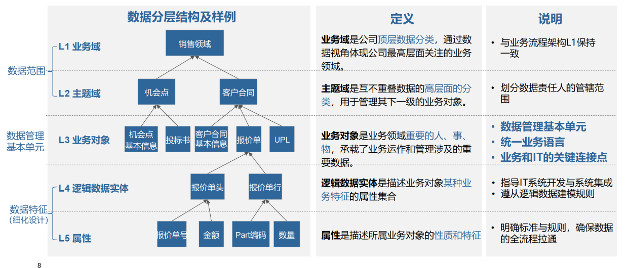 L4 逻辑数据实体:描述业务对象某种业务特征的属性集合,指导IT系统开发与系统集成。