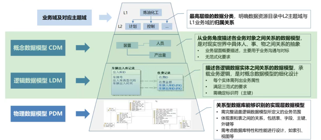 概念数据模型(CDM):从业务角度描述各业务对象之间的关系,是对现实世界中具体人、事、物之间关系的抽象。主要用于业务沟通与对标,无范式化要求。