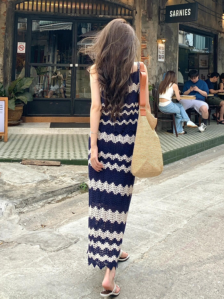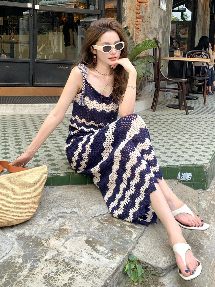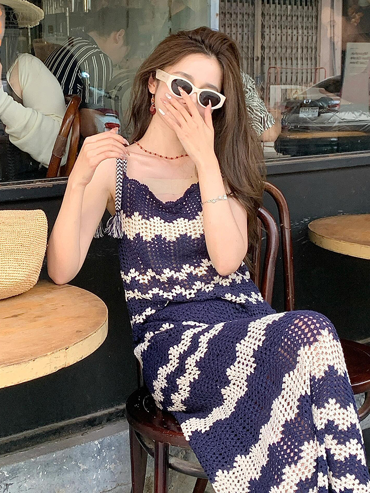 法式沙滩海边度假藏蓝色镂空吊带套装裙夏