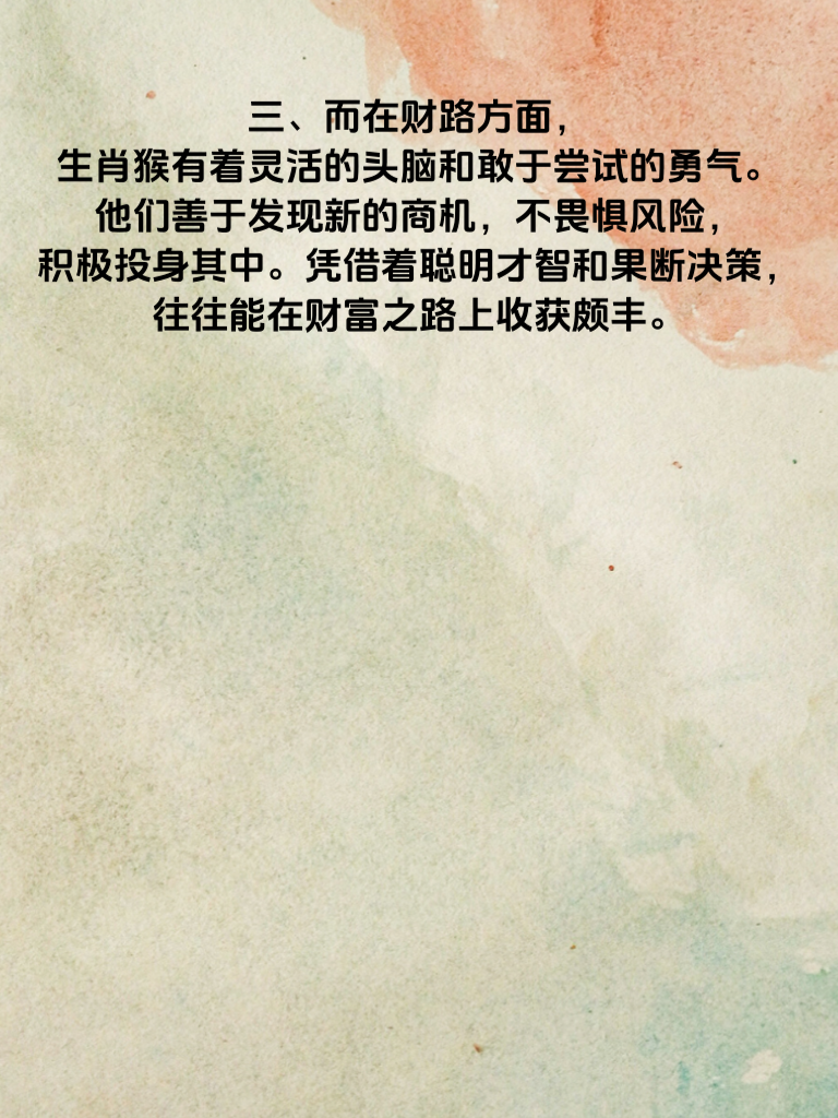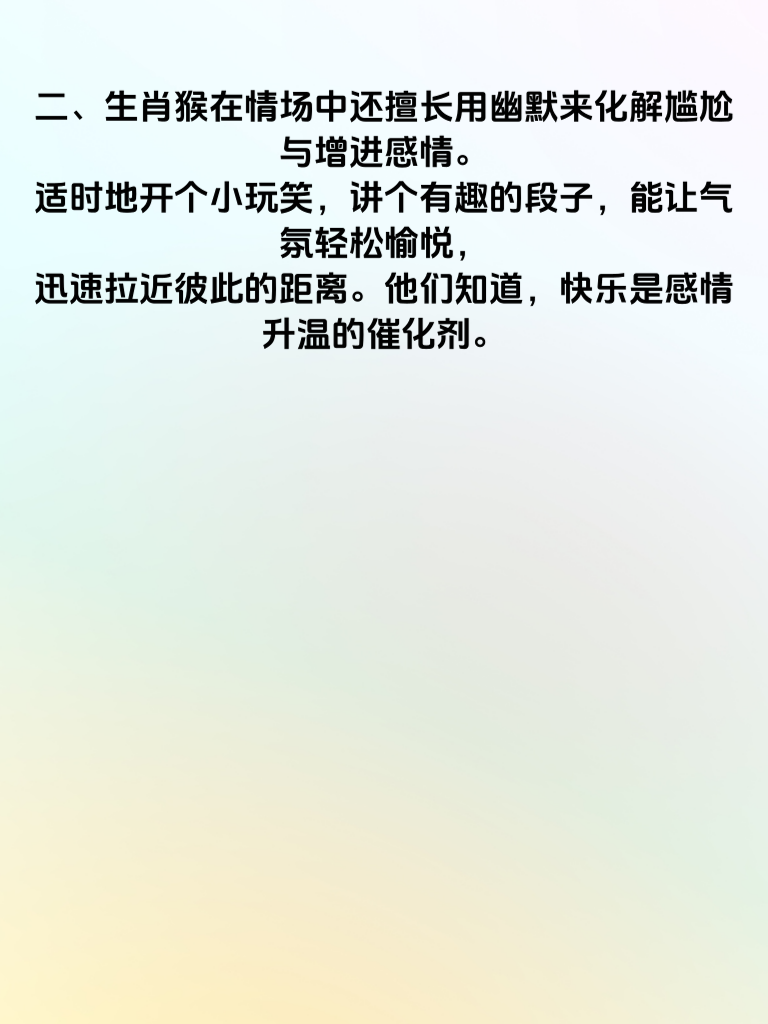 一、2025 年生肖猴的朋友们,在情场上有着独特的智慧。他们懂得用敏锐的观察力去捕捉心仪之人的喜好。比如,会细心留意对方日常的穿着风格,从而在不经意间送上一份符合其品味的小礼物,让对方感受到满满的用心。 二、生肖猴在情场中还擅长用幽默来化解尴尬与增进感情。适时地开个小玩笑,讲个有趣的段子,能让气氛轻松愉悦,迅速拉近彼此的距离。他们知道,快乐是感情升温的催化剂。 三、而在财路方面,生肖猴有着灵活的头脑和敢于尝试的勇气。他们善于发现新的商机,不畏惧风险,积极投身其中。凭借着聪明才智和果断决策,往往能在财富之路上收获颇丰。 四、同时,生肖猴懂得合理规划自己的财务。他们不会盲目消费,而是会根据自己的实际情况进行理财。无论是储蓄还是投资,都有着清晰的规划,为自己的富贵生活打下坚实基础,实现情场智胜与财路广开,让富贵长久相伴。