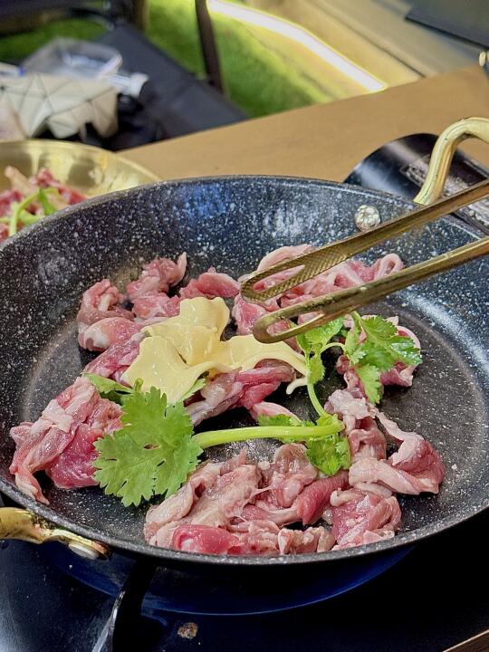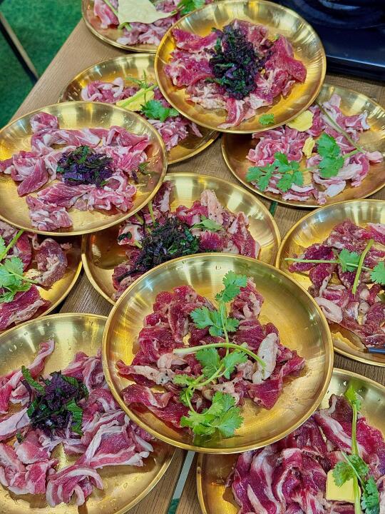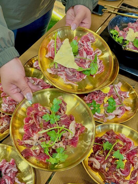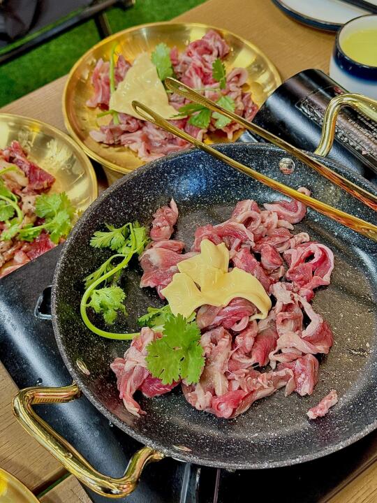 最近挖到这家自带秋日滤镜的宝藏酒吧! 店里枫树🍁红得超有氛围感, 坐在草坪上烤肉像在秋日野餐~ 重点是一整桌牛肋条放题吃到爽![得意] 🥩牛肋条居然有5种口味! 紫苏叶版烤出清香, 黄油🧈版奶香直冲天灵盖, 芝士🧀控必冲拉丝瀑布款! 每块肉🥩都带雪花纹, 自己用黄油煎到滋滋冒油超解压, 蘸烤肉酱一秒魂穿延吉[哇R] 晚上灯光暗下来, 秋风+烤肉香+live音乐+微醺🍸 这才是成年人的过家家吧😌!!!