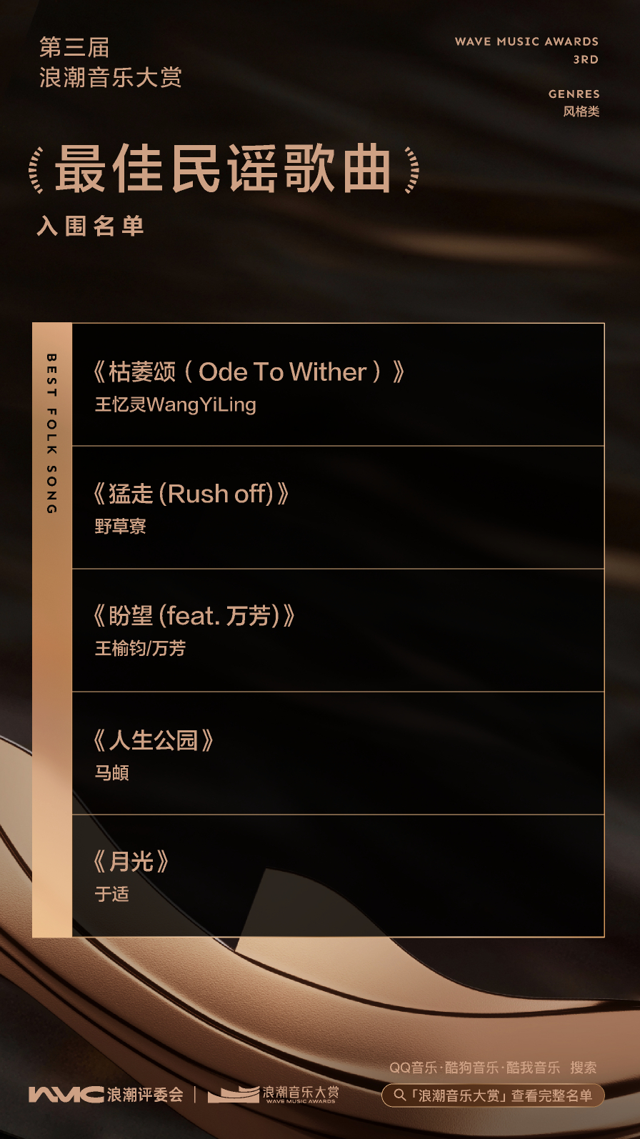今年的入围呈现出了成熟和多样化的面貌。从音乐创作到制作,再到背后支持的每一位创作者,整个华语音乐生态正在不断演化,越来越多的音乐人才得到了应有的关注和认可。无论是流行音乐的创新,还是说唱、摇滚等小众音乐风格的崛起,都代表着华语音乐在不断成长,这次的入围作品也真正体现了华语音乐市场的包容性~ 第三届浪潮音乐大赏入围名单