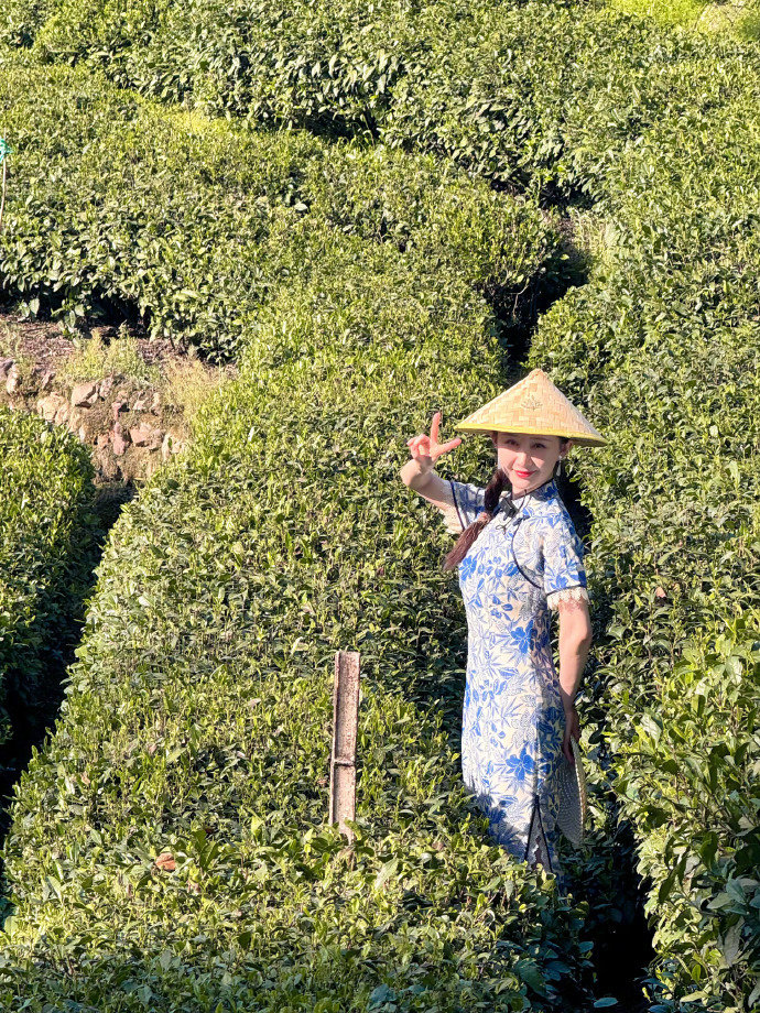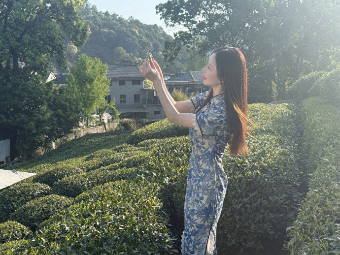 舒畅38岁状态舒畅茶田旗袍装 春游采茶,旗袍将姐姐的气质更好的凸显出来了,又清新