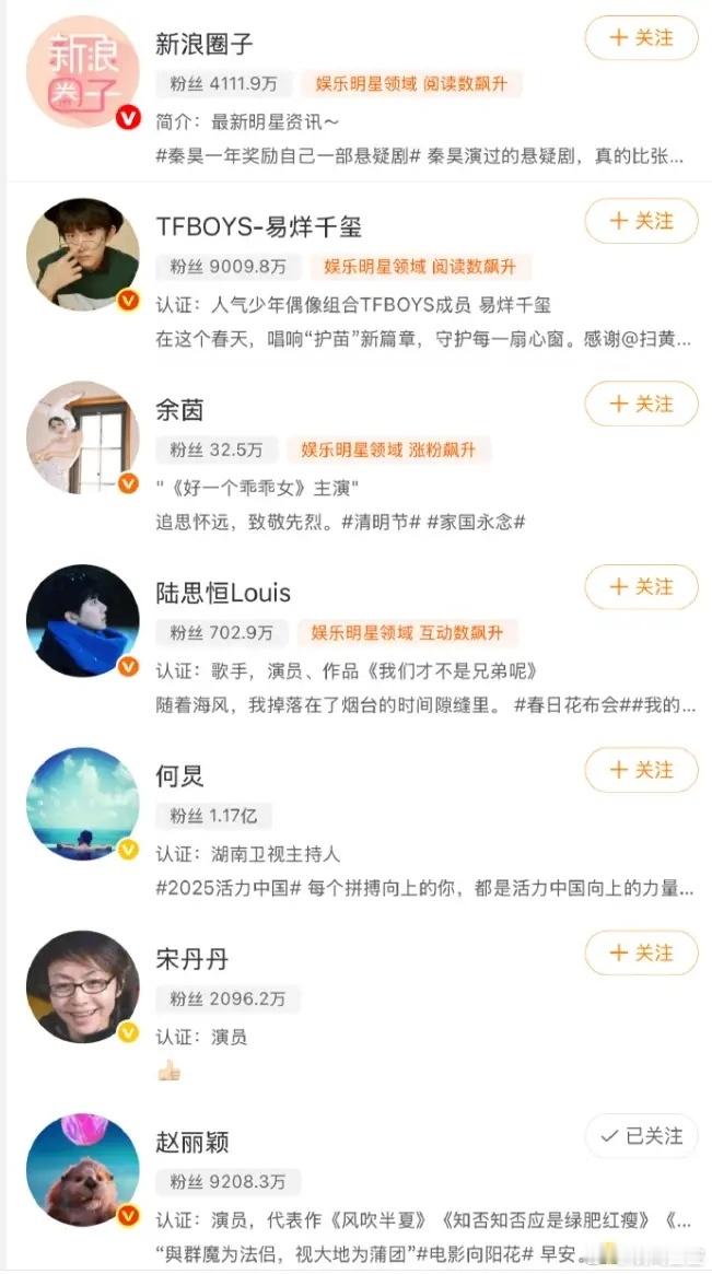 他是真的很喜欢赵丽颖,他微博开通后只关注了7个娱乐明星,最先关注的就是赵丽颖和易烊千玺,其他几位是宋丹丹,何炅,看来他也很慕强,这么多当红和顶流艺人,他只关注了赵丽颖和易烊千玺。