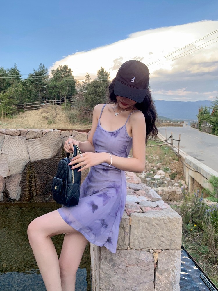 法式蝴蝶印花网纱吊带连衣裙设计感收腰短裙
