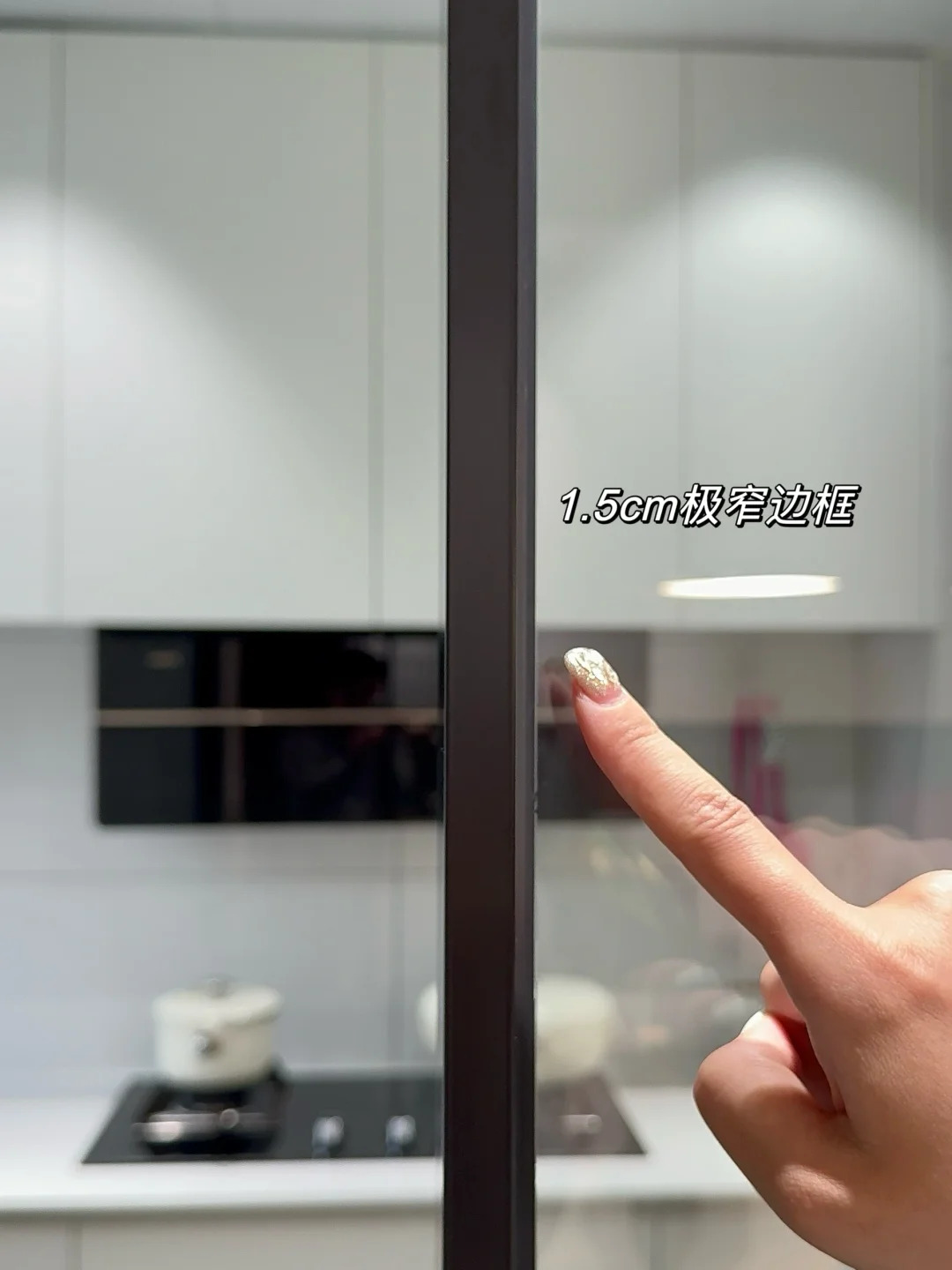 哈喽,我是甜甜 一眨眼新家已经入住三年啦 还是很喜欢我家的小餐厅 忍不住再给大家分享下~ - 餐厅尺寸2.7米×2.7米 餐厅虽不大,但我还是坚持做了深度30cm的餐边柜,不仅能增加收纳空间,还可以遮丑😂,平时餐厅用不到的东西都藏在柜子里~上下柜门都是免拉手的设计,简约大方,白色柜门不压层高,餐厅虽小,但也没有拥挤的感觉 - 我家餐厅和厨房紧邻,曾经也想着做开放式的厨房,但是考虑到安全问题,和油烟逸散不方便,最后还是选择装个推拉门 - 结合产品的颜值、耐用性考虑,我选了有口碑保障的凤铝高端系统门窗,毕竟是很多人都知道的大品牌,品控还是比较好的 - 型号选的是美度GDM150C极窄推拉门,极窄边框搭配全景玻璃视野非常的开阔,门完全打开就能获得一个“伪开放式厨房” - 它有个细节很妙,推拉时有双向的阻尼缓冲,遇到爱折腾的小孩安全感拉满,缓冲回弹不怕夹到小手 - 轨道和吊轮五金全都隐藏在里面不外露,不仅美观,打理卫生也超方便,上轨道还带有防摆滑轮,推拉稳固不晃,感觉使用寿命应该挺长的 - 厨房装推拉门真的很有意义,做饭的时候虽然门关上了,但还是可以通过玻璃观察娃的动态,免得孩子在悄悄捣乱 - 而且关门可以防止油烟逸散到客厅,开门就能和待在客餐厅的家人唠嗑,互动感不输开放式厨房 - 希望今天的分享可以帮助到大家哈~